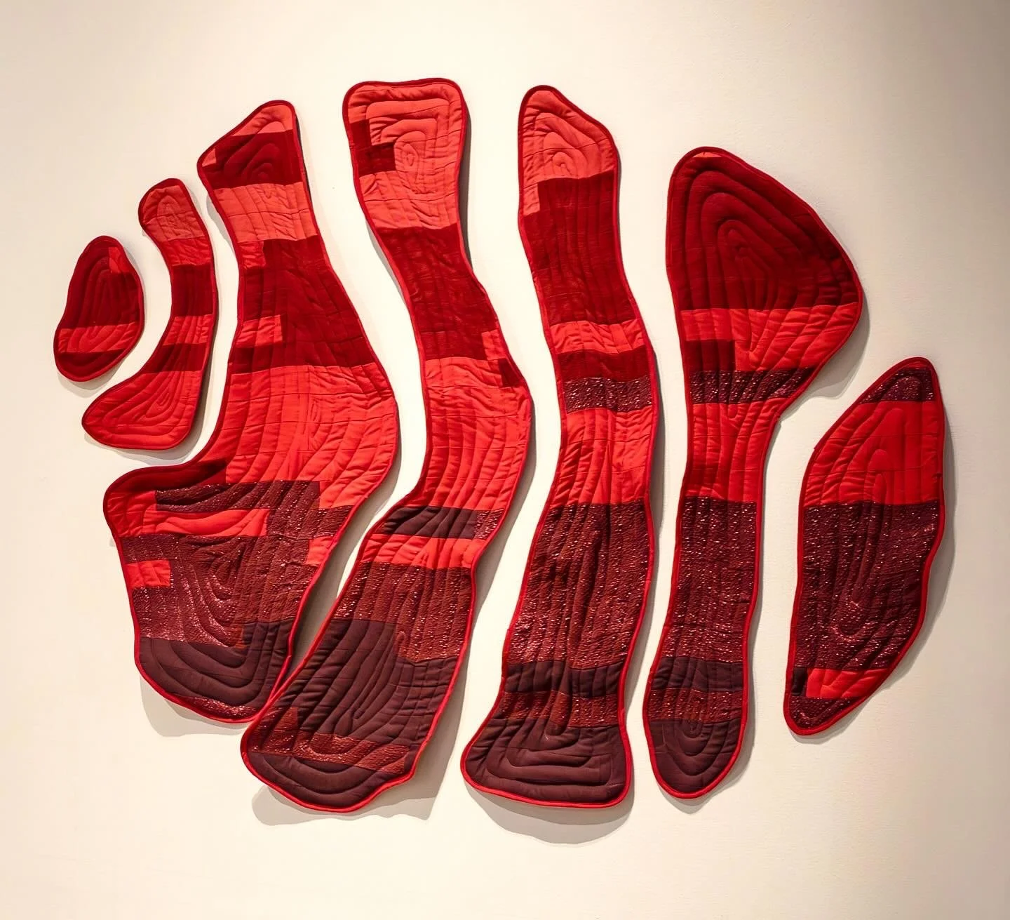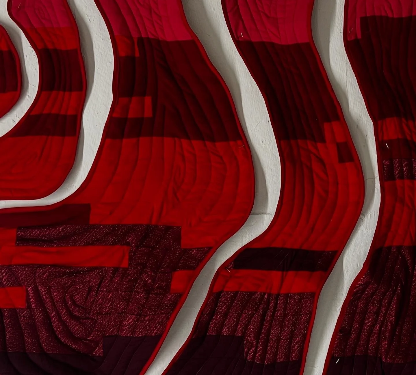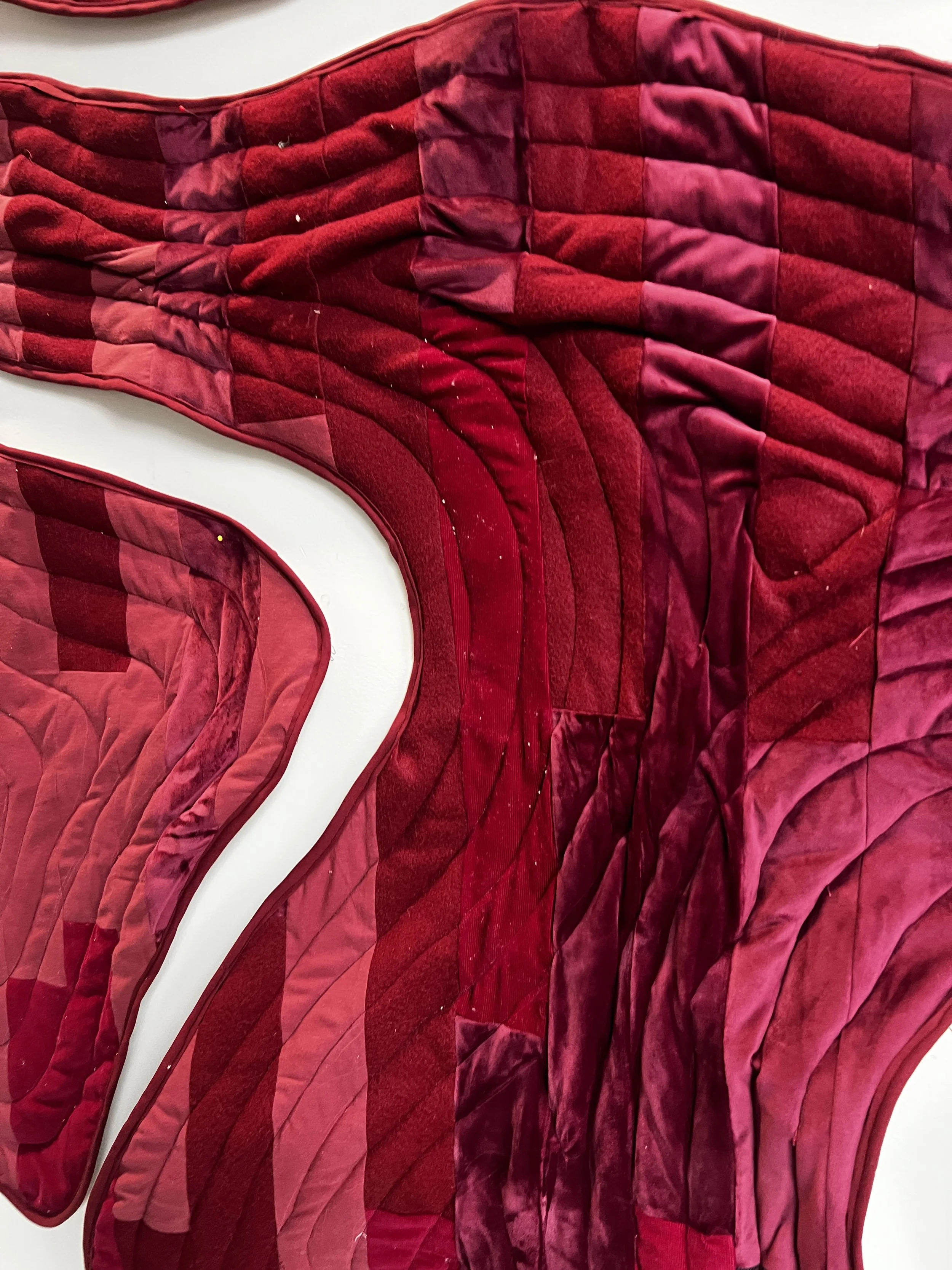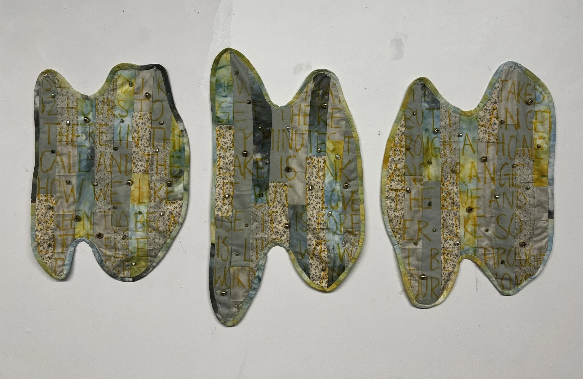 The works in this collection span several years and continue to be joined by new pieces. The works relate in their materials and techniques, taken from a tradition of quilting, and forms, referencing abstract bodies of water. In recent years there has been additional experimentation in materials and surface treatment, including experiments with a pushed three-dimensionality and the use of the written word. This body of work has served as a touchstone while allowing for experimentation within the craft of quilt-making.